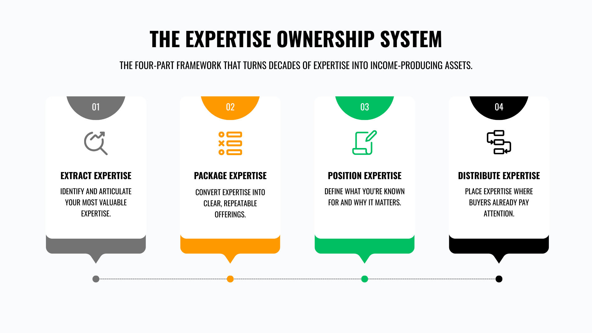 Expert to $100k+ details the Expertise Ownership System by providing the step by step process for turning decades of expertise into income-producing assets.